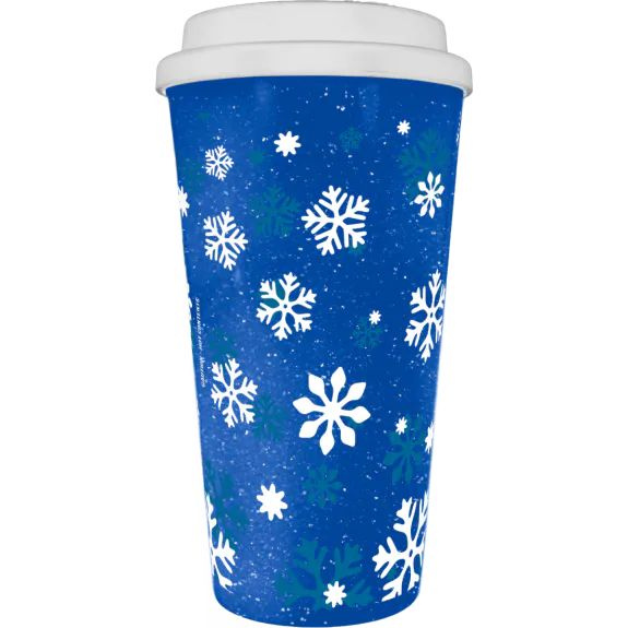 New for 2025...Double Wall Souvenir Holiday Drink Cups. Great cup for the holiday Season and throughout the winter months. Features a double-wall insulated hot cup with a snowflake design and blue glitter print. Also, it features a white raised-up lid. 24 cups and lids per case.